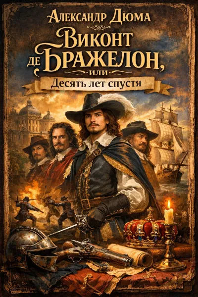 «Виконт де Бражелон, или десять лет спустя» — заключительная часть трилогии о мушкетёрах.Короля Франции подстерегают враги и любовь, сторонники кардинала готовят заговор, человек в железной маске оказывается на троне — во всех сногсшибательных приключениях участвуют всё те же д'Артаньян, Атос, Портос, Арамис и сын Атоса — виконт де Бражелон.