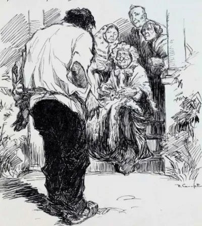 Один из троих босяков, подрядившихся ломать старую баню у набожной старушки, вырвал с мясом из переплёта старинной библии хозяйки две серебряные застёжки. Его товарищ отдаёт ему все свои заработанные гривенники, прося вернуть украденное и уверяя того, что такую книгу портить негоже...